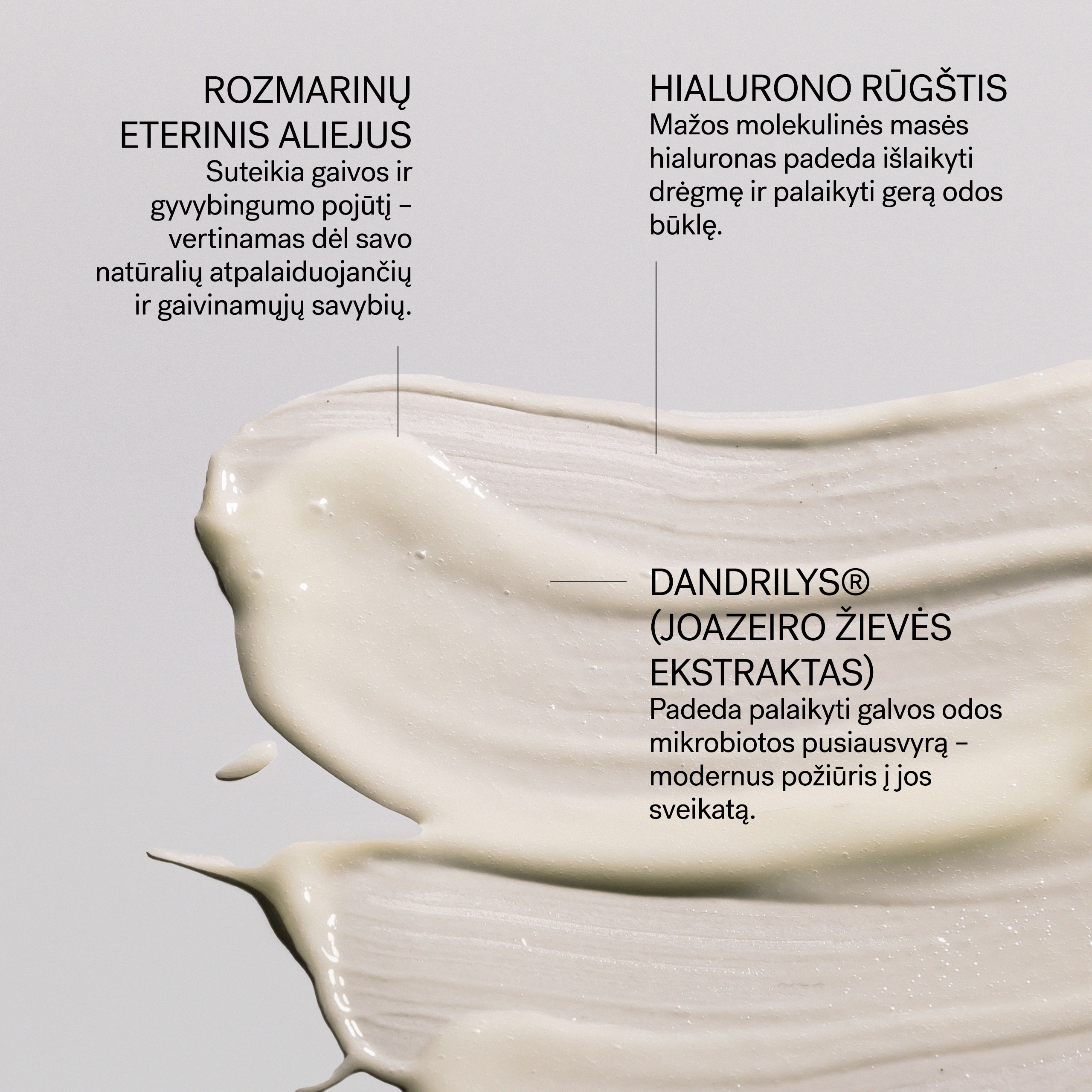 Sausa, niežtinti galvos oda – būsena dažniausiai kelianti nemenką diskomfortą. Kartais užtenka pakeisti naudojamas priemones, kartais sumažinti vandens temperatūrą galvos plovimo metu, o kartais į pagalbą prireikia pasitelkti ir specialiai tam suformuluotas priemones. Dear Roots kaukė sausai niežtinčiai galvos odai praturtinta prebiotikais, galvos odos mikrobiotos palaikymui, hialurono rūgštimi drėkinimui, biotinu (vitaminu B7), pantenoliu (vitaminas B7), ekologiškais, šalto spaudimo nerafinuotais jojoba, avokadų aliejais odos ir plaukų maitinimui, stiprinimui, raminimui ir geros būklės palaikymui bei pipirmėčių, rozmarinų, arbatmedžio eteriniais aliejais ir Dandrilys (Joazeiro žievės) ekstraktu, kovojančiu su odos mikrobiotos disbioze.