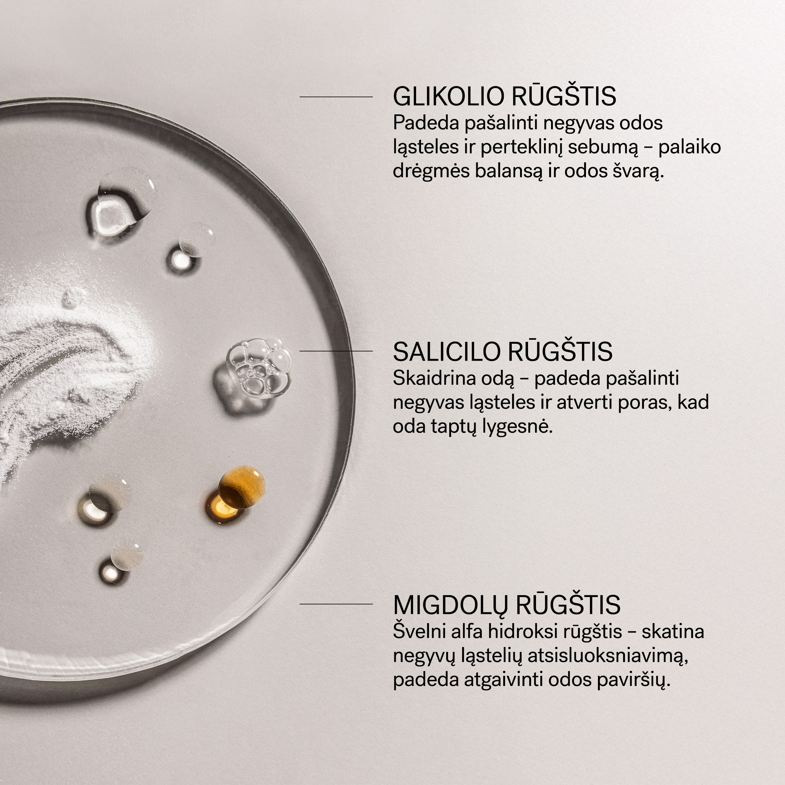 AHA + BHA rūgščių kompleksas cheminiam galvos odos eksfoliavimui. Galvos odos šveitimas padeda sukurti geresnes sąlygas sveikų ir gražių plaukų augimui, išvalant susikaupusius odos nešvarumus, naudojamų priemonių likučius, negyvas odos ląsteles.