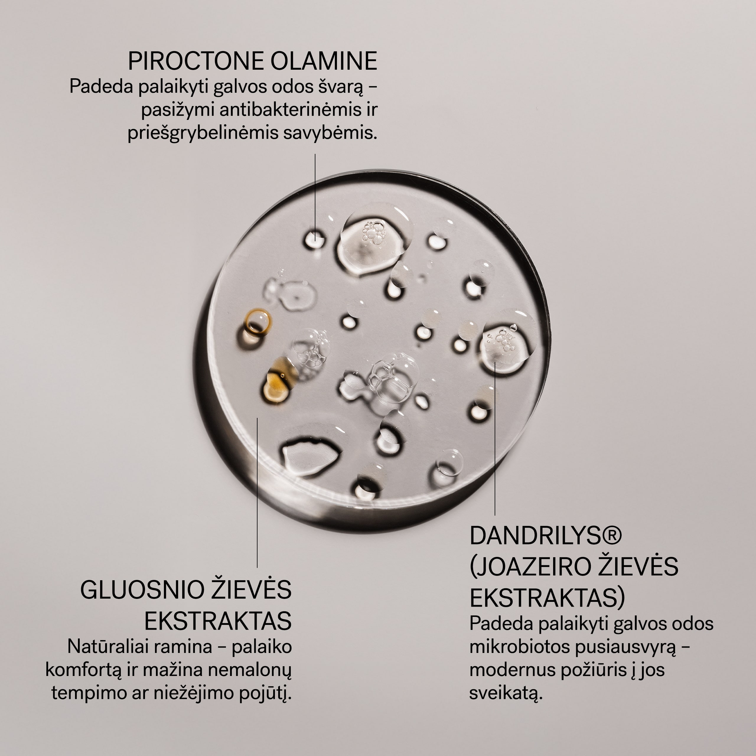Gausybė ekstraktų (gluosnio žievės, azijinės centelės, asiūklių, saldymedžio šaknų, varnalėšų šaknų, Joazeiro žievės), vitaminai (niacinamidas, pantenolis), alavijas, cinko PCA kartu su efektyviu su pleiskanomis ir seborėjiniu dermatitu kovojančiu piroktono olaminu – viskas viename serume atsisveikinimui pleiskanomis.